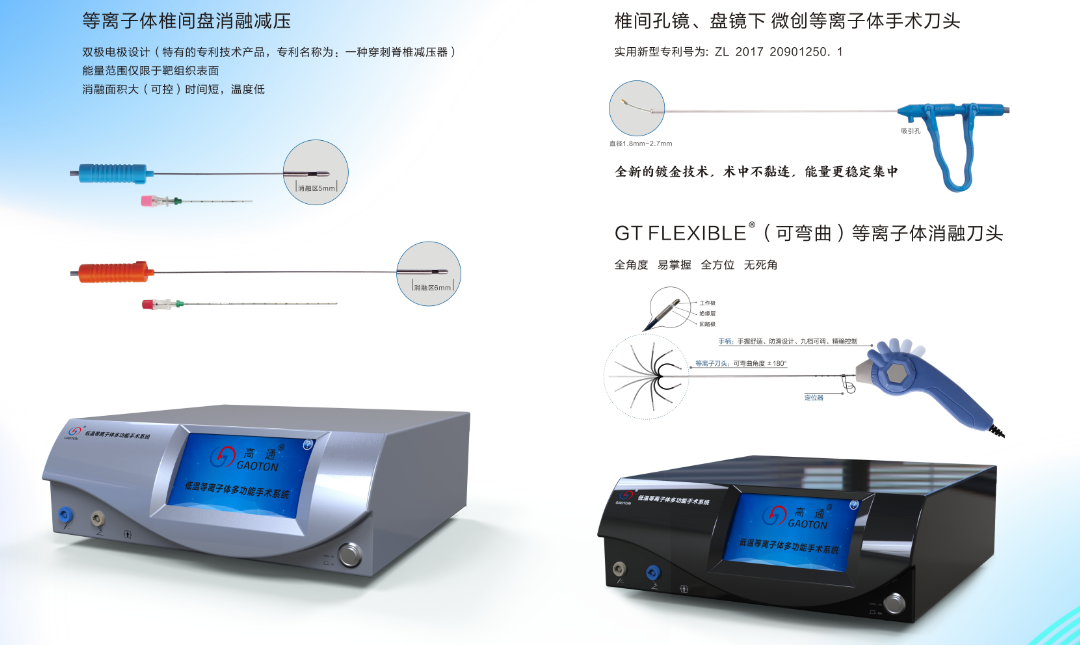 等离子体技术是一种特定波形下的电能通过多极刀头在人体组织中激发血液、粘膜、髓核组织的胶原蛋白分子中的介质( Nacl)产生等离子体状态,再由等离子体中的高速带电粒子直接打断组织分子键,使组织蛋白汽化分解成H2、O2、CO2、N2和甲烷等低分子量气体,达到对组织的汽化、切割、打孔、消融、皱缩、剥离、止血、修复作用。